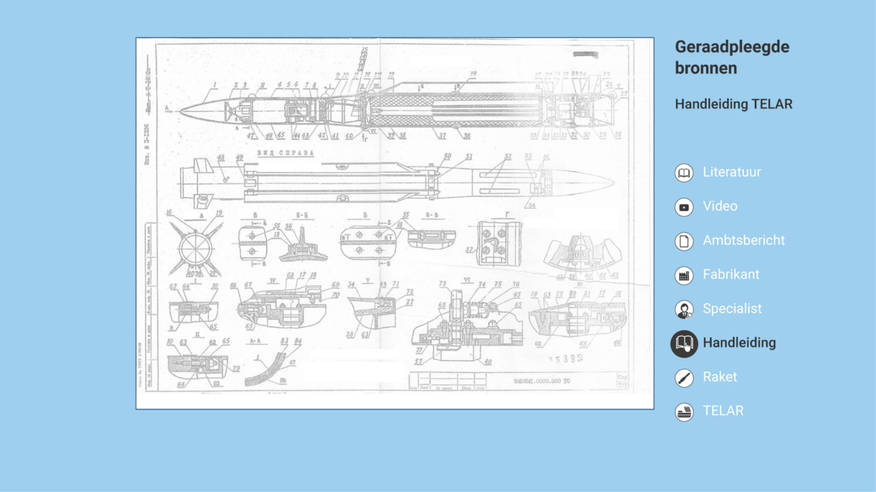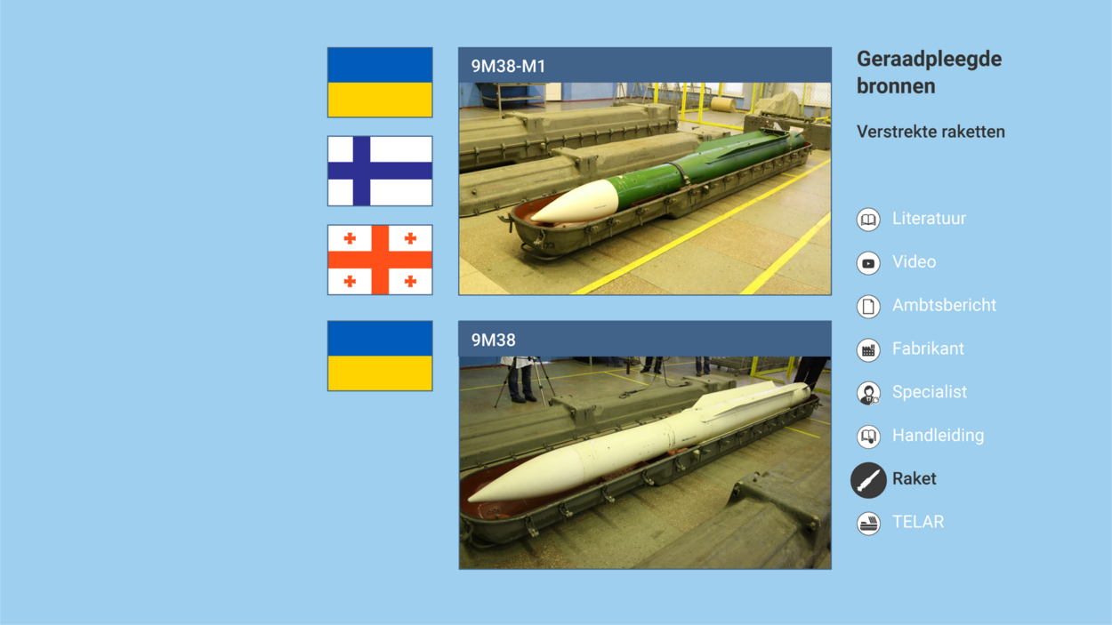 Die verzamelde bronnen bestaan uit militaire literatuur (zoals Jane’s Defence Weekly), maar ook uit foto- en videomateriaal van Buk-systemen op internet. Ook bestaan zij uit ambtsberichten van de MIVD en brochures van fabrikanten en leveranciers van verschillende onderdelen van het Buk-systeem. Inmiddels zijn die fabrikanten onderdeel van één concern: Almaz Antey. Ook van Almaz Antey en andere Russische defensiespecialisten hebben wij informatie ontvangen. Daarnaast hebben wij Oekraïense gebruikers van het Buk-systeem, Nederlandse defensiespecialisten en een Duitse raketgeleerde gehoord. Verder hebben we technische handleidingen van de raket en de TELAR ontvangen. Deze zijn afkomstig uit Oekraïne en Georgië en komen inhoudelijk overeen. Vanuit Oekraïne hebben we ook nog trainingshandleidingen ontvangen voor de bemanning van het Buk-systeem en de TELAR.