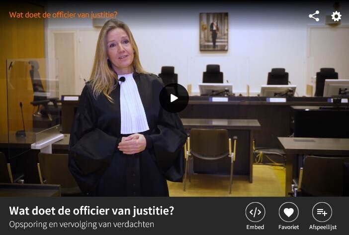 De officier van justitie wordt door de politie gebeld als er een misdrijf gepleegd is. De officier van justitie moet toestemming geven om een verdachte aan te houden. Tijdens een rechtszaak houdt hij of zij een requisitoir, hierin worden de bewijsmiddelen verteld en wordt de straf geëist. Bekijk het filmpje