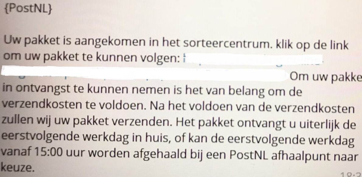 In een van de aangetroffen oplichtings-sms’jes stond de tekst: ‘Uw pakket is aangekomen in het sorteercentrum, klik op de link om uw pakket te kunnen volgen: …… Om uw pakket in ontvangst te kunnen nemen is het van belang om de verzendkosten te voldoen.’