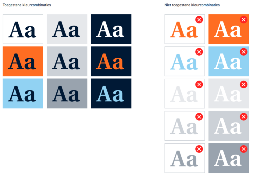 Sommige combinaties van tekst en achtergrond hebben niet genoeg contrast. Hiernaast zie je de combinaties die mogelijk zijn om te voldoen voldoen aan de norm AA van de WCAG.