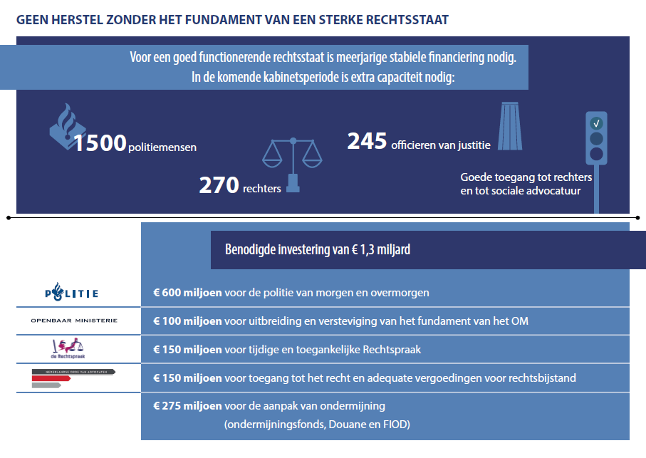 Herstel van ons sociaal-maatschappelijke welzijn en van onze economie moet gestut worden door stabiele en goed onderhouden rechtsstatelijke instituties. Vertrouwen in de overheid begint met het waarborgen van de veiligheid van mensen, met het aanpakken van misstanden en strafbare feiten, met rechtszekerheid en rechtsbescherming en een open toegang tot de rechter en tot rechtsbijstand. Degelijke financiering van die rechtsstatelijke instituties is een absolute noodzaak. Als investeringen uitblijven, kan misdaad minder effectief worden bestreden. Criminelen pakken meer ruimte, onze fysieke en digitale samenleving raakt verder ontwricht en onze jongeren worden vaker verleid of gedwongen om te kiezen voor een criminele carrière.