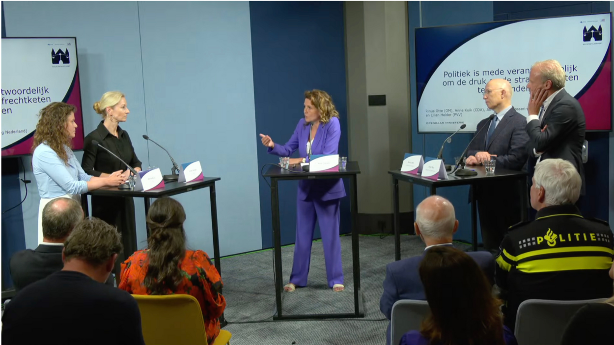 ‘Primair moet het strafrecht beter functioneren dan het nu doet, en daar doen we alles aan, maar het is een wisselwerking met de politiek, met de wetgever’, stelde Rinus Otte, voorzitter van het College van procureurs-generaal. ‘We moeten ons met elkaar realiseren dat de legitimiteit van het strafrecht onder druk komt te staan als we het strafrecht gaan inzetten om maatschappelijke problemen op te lossen. Dat kunnen we ook niet waar maken. Strafrecht komt vaak aan het eind van een lange rij met problemen en dan is zorgen dat de wet goed wordt toegepast op een proportionele en rechtmatige wijze, vaak nog het enige wat je kunt doen.’
